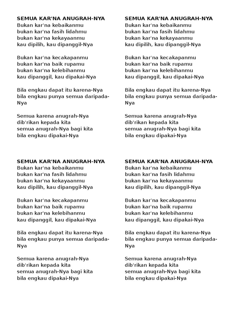 Semua karena anugerahmu semua karena kemurahanmu semua karena campur tanganmu kini semuanya untuk kemuliaanmu