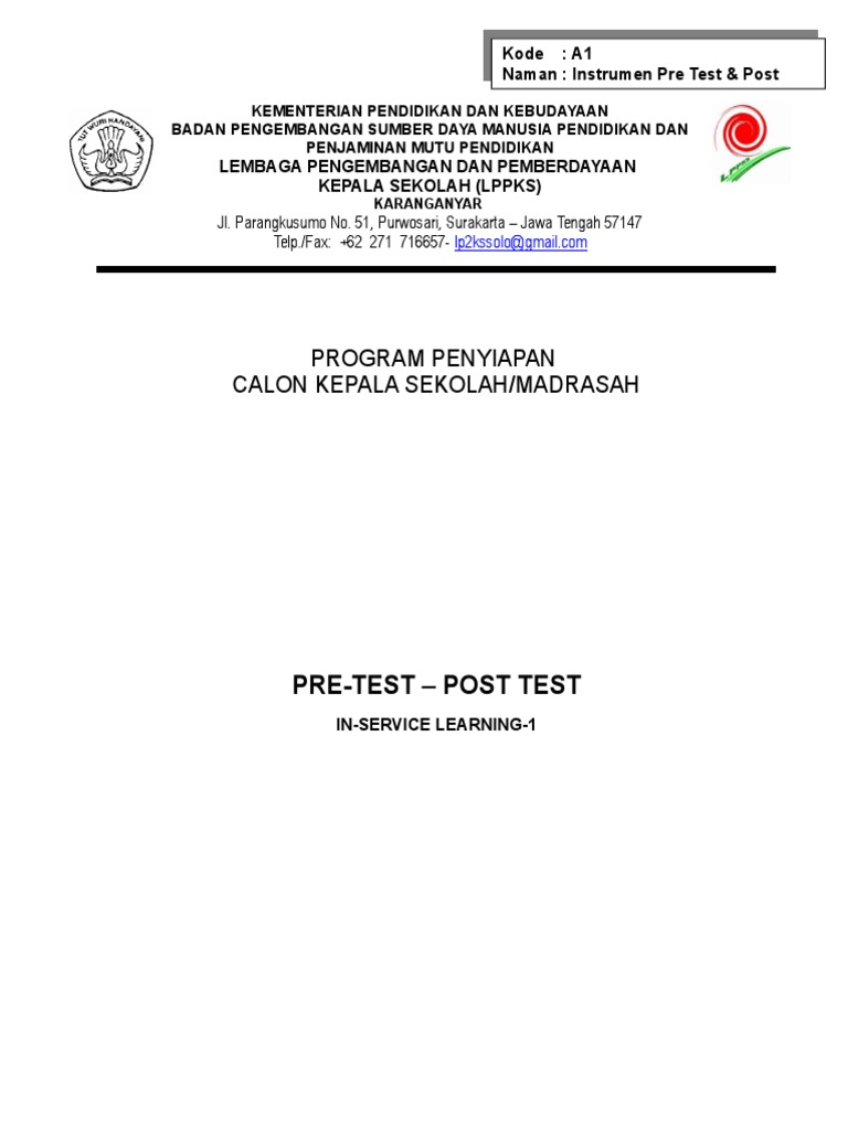 Kunci jawaban dan pembahasan latihan soal post test pkp. Dalam pelaksanaannya, tes substansi dilaksanakan dalam 2 tahap yaitu seleksi tertulis dan wawancara. Latihan soal dan jawaban seleksi calon kepala sekolah materi kompetensi kepala sekolah. Pengawas sekolah juga harus mengikuti berikut ini contoh dan cara soal pre test (pretest) pengembangan keprofesian berkelanjutan pengawas a. Berikut ini contoh soal post test (posttest) pengembangan keprofesian berkelanjutan pengawas sekolah (madrasah).